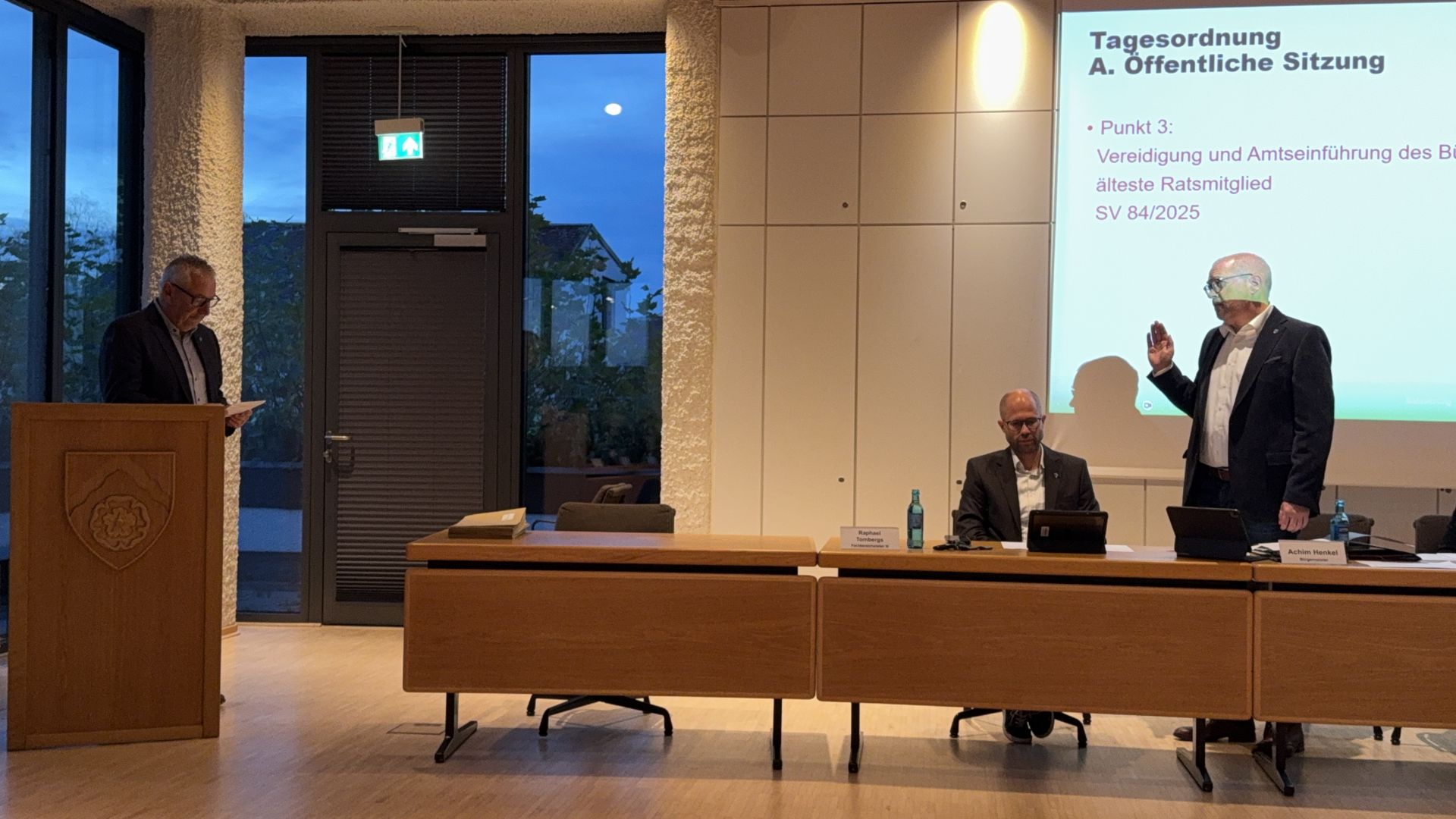 Wir alle sind sehr froh, dass ich Dir heute dann erneut den Dienst- bzw. Amtseid abnehmen und Dich in das Amt des Bürgermeisters einführen darf.