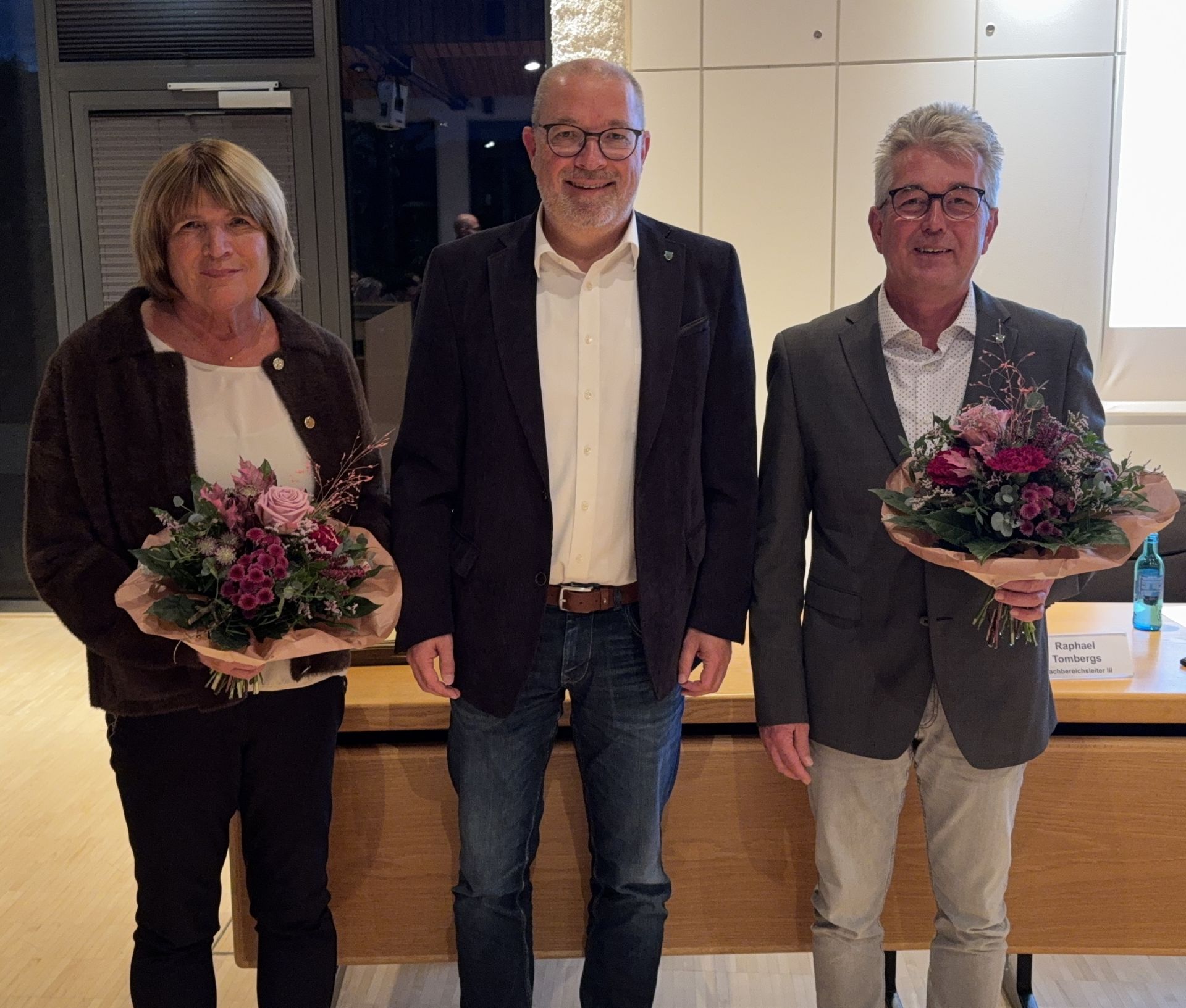Bürgermeister Achim Henkel gratulierte Bernadette Gastreich und Ralf Paul Beckmann nach ihrer Wahl zu seinen Stellvertretern mit einem Blumenstrauß (Foto: Martin Hageböck, CDU-Fraktion)